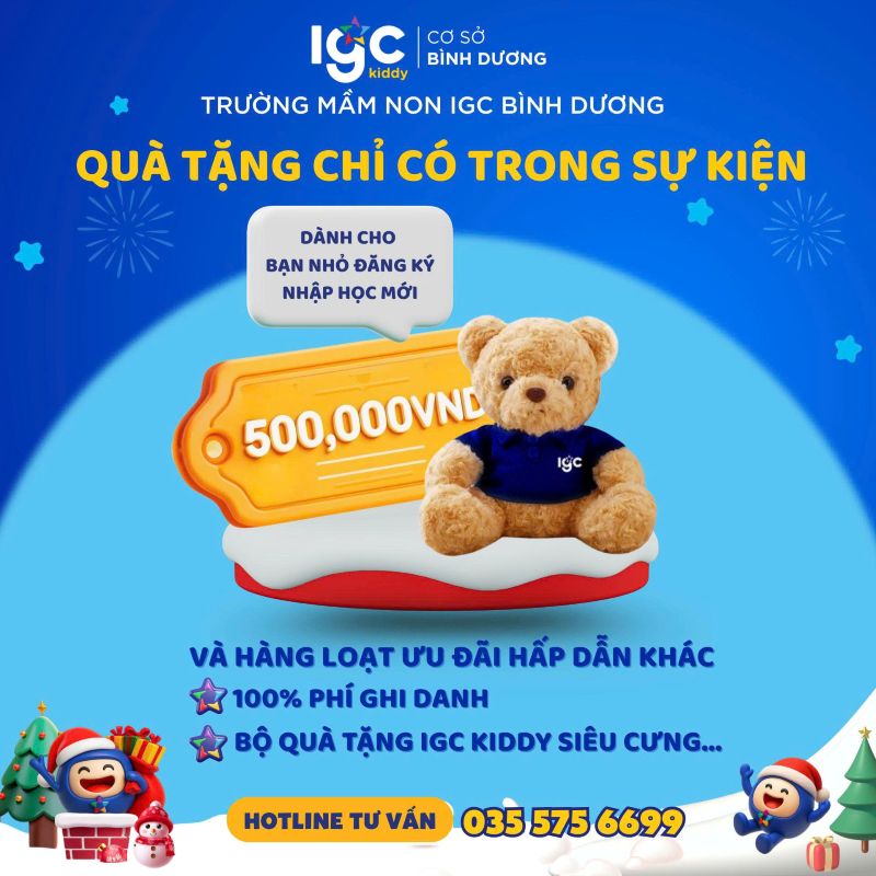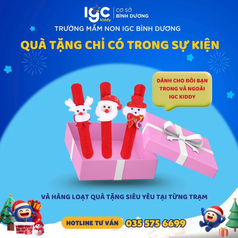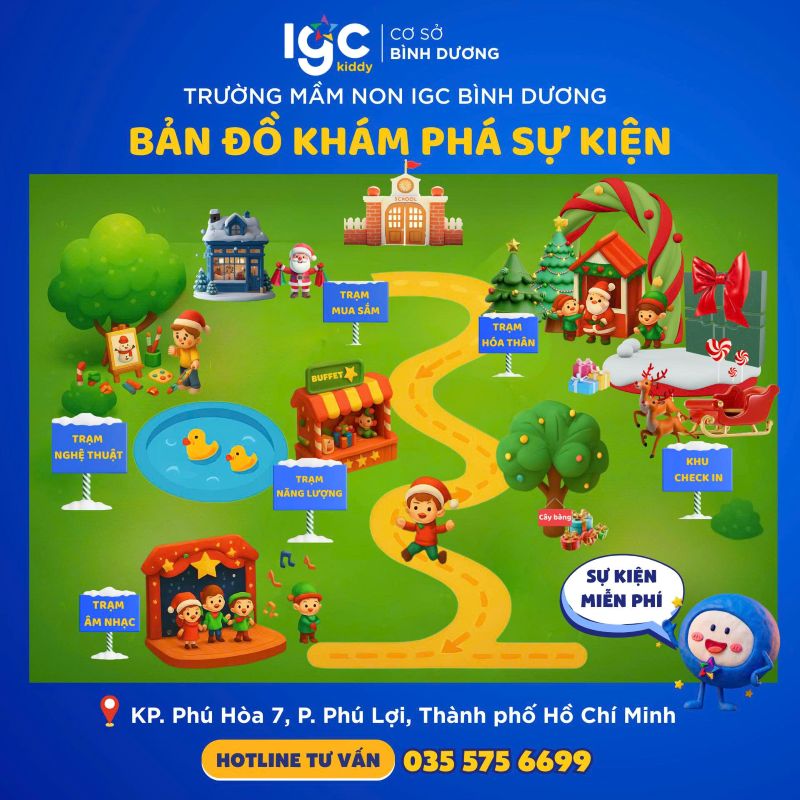 Thời gian: 15h30_17h00, Thứ ba, ngày 23 tháng 12 năm 2025. Địa điểm: Trường Mầm non IGC Bình Dương, Khu phố Phú Hòa 7, P. Phú Lợi, TP. Hồ Chí Minh Hàng loạt hoạt động hấp dẫn trong sự kiện: - Giai điệu giáng sinh. - Trạm hóa thân Ông già Noel. - Góc tạo hình kỳ diệu Giáng sinh. - Bữa tiệc sắc màu lễ hội. - Cửa hàng quà tặng Sự kiện hoàn toàn miễn phí dành cho học sinh trong và ngoài trường. Ba mẹ nhanh tay đăng ký ngay để không bỏ lỡ cơ hội cùng con tạo nên những ký ức thật đáng nhớ cùng thầy cô và bạn bè nhé!
