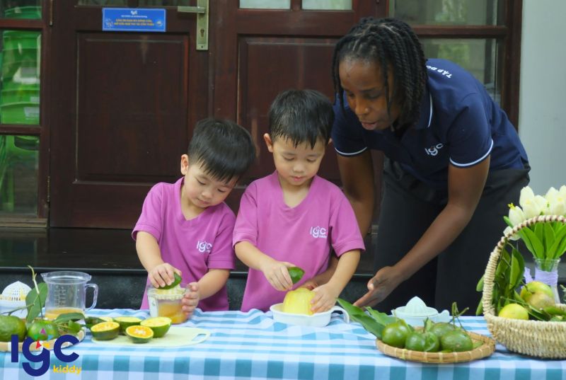 Các bạn nhỏ cùng giáo viên nước ngoài ra vườn “hái cam”, vừa học từ vựng về màu sắc, vị chua – ngọt, các giác quan, vừa tự tay vắt nước cam tươi. Qua đó, các con không chỉ học được những từ mới như orange, sweet, sour, juice, squeeze mà còn hiểu sâu hơn về hương vị và cảm giác thật của từng từ.
